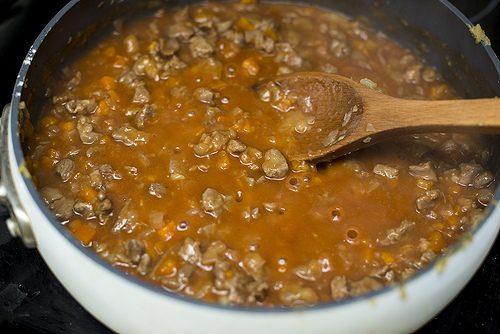 Постепенно вливаем бульон, добавляем томатную пасту, ворчестерский соус, травы и специи. Доводим смесь до кипения, затем уменьшаем огонь и тушим 10 минут.