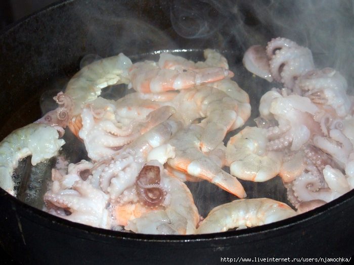 При комнатной температуре (или под струёй прохладной воды, но не в коем случае не в микроволновой печи) полностью размораживаем морепродукты и промываем их.