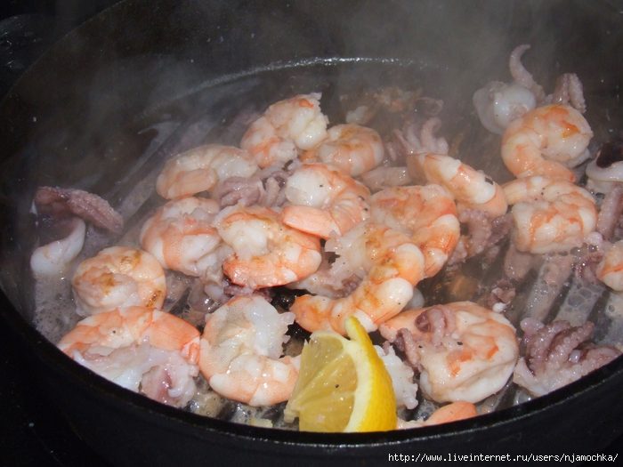 Далее, очень хорошо разогреваем сковороду гриль (или обычную). Слегка смазываем маслом и выкладываем морепродукты. Готовим не более 5 минут!