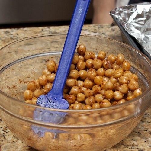 Выпекать в течение 45-60 минут, помешивая каждые 15 минут. Готовый горох нут посыпать солью, как только удалите из духовки, пока горох горячий. Дайте полностью гороху остыть, затем переложить в миску.