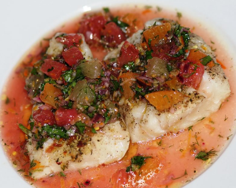 11. Рыбу достать из духовки. Выложить рыбу на тарелку и добавить сверху цитрусовую сальсу.