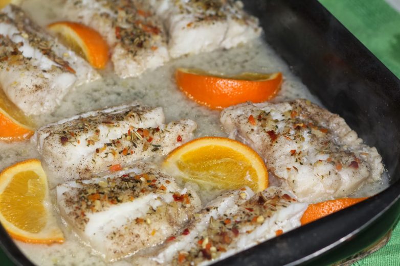 3. Смазать форму сливочным маслом, выложить филе трески и дольки апельсина. Посолить, поперчить и посыпать рыбу приправой. Влить вино.