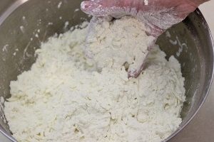 часто останавливаясь, чтобы сразу смешать хлопья сливочного масла с мукой, чтобы оно не слипалось.
