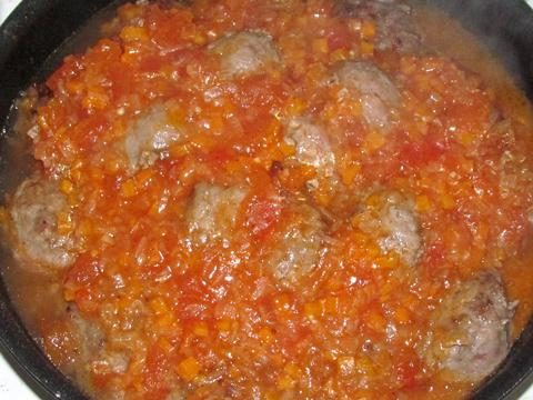 Когда весь фарш превратился в будущих ёжиков и обжарен, складываем получившиеся шарики в сковороду или кастрюлю для тушения. Тушить можно в воде или любом соусе по вкусу.