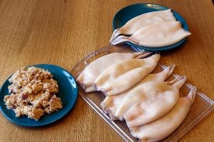 Ингредиенты те же, только без вина. Тушки кальмаров предварительно отварить и наполнить готовой начинкой.