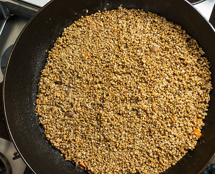 А потом гречку надо выложить на сухую, без масла сковороду и прокалить. Огонь под сковородкой надо держать выше среднего, помешивать гречку следует часто.