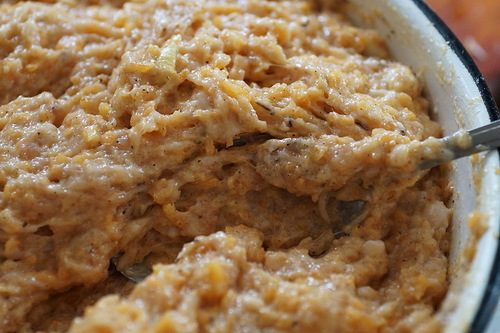 Кусочки хлеба заливаем молоком для размягчения… а тыкву измельчаем… можно в блендере Составляем триединство