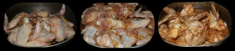 Подготовленную смесь перемешиваем, добавляем 3 столовые ложки оливкого масла и добавляем крылышки.