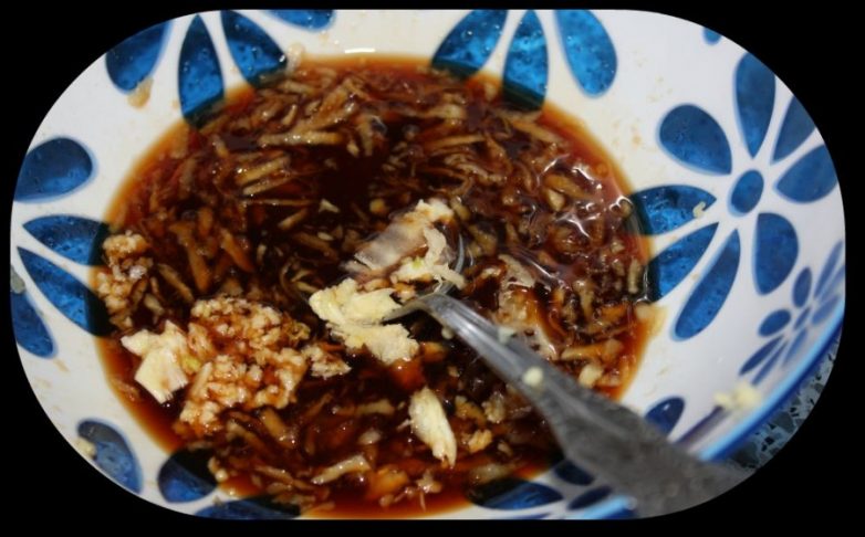 Итак, берем мед — 3 столовые ложки. Добавляем туда такое же количество соевого соуса. Берем примерно 3 сантиметра имбиря трем на терке, чеснок пропускаем через пресс и добавляем туда же.