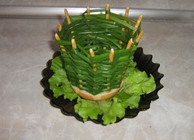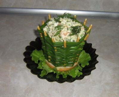 В такую прекрасную корзинку можно насыпать совершенно любой на ваш вкус салат. Сделать ее совсем несложно, зато смотреться на столе она будет более чем эффектно. А восторженные возгласы гостей 100% гарантированы!