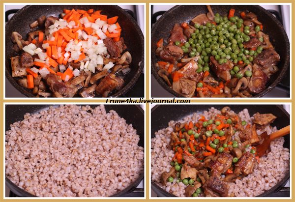 Морковь нарезать соломкой, лук кубиками. Добавить овощи к мясу и грибам, тушить 10 минут под закрытой крышкой.Когда овощи станут мягкими добавить горошек (предварительно разморозив его) и готовить не больше 2 минут.Перловую крупу промыть и замочить в большом количестве воды на ночь. Утром воду слить, еще раз промыть и сварить перловку до готовности в подсоленной воде. Когда перловка будет готова, воду слить и укутать кастрюлю одеялом, тогда она вся раскроется и будет очень мягкой и красивой.К перловой крупе добавить овощи и грибы. Аккуратно перемешать, подержать на огне 1-2 минуты и подавать к столу.