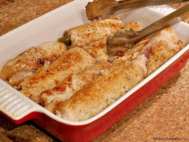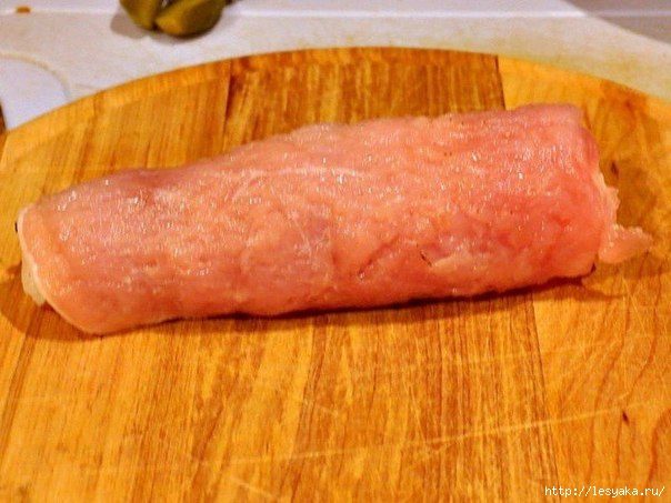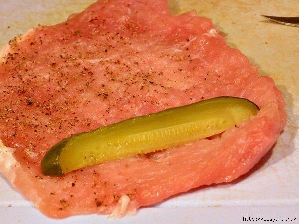 Порезать тонкими пластами свиную вырезку. Нарезанные куски обернуть пленкой и отбить. Переложить в посуду, добавив соль и перец. Поделить на 4 части каждый соленый огурец. Выложить на отбитое мясо кусочек огурца и завернуть в виде рулета. Обжарить около 3-5 минут на растительном масле каждую сторону такого рулета (на небольшом огне). Переложитьвсе в специальную форму для выпечки. Перед тем, как выпекать, духовку необходимо прогреть до 200 градусов. Блюдо будет готово через 15 минут.