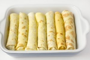 Так заворачиваем все блины — получившиеся рулеты выкадываем в форму для запекания.