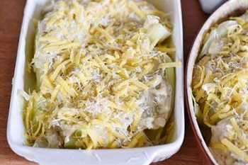Потереть твердый сыр. Идеально подойдет голландский сыр или любой другой твердый, ароматный сыр. Духовку нагреть до двухсот градусов и поставить форму с запеканкой. Запекать около пятнадцати минут до румяной корочки.