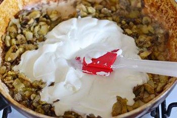 Выложить сметану в сковороду, посолить и поперчить. Тушить пять минут на небольшом огне.