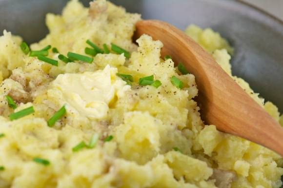 Картофель очистите и отварите до готовности в подсоленной воде. Воду, в которой варился картофель, слейте в отдельную кастрюлю. Добавьте к картофелю сливки (сметану), залейте половиной картофельного бульона и томите под закрытой крышкой в течение 2-3 минут на маленьком огне. Снимите кастрюлю с огня, картофель растолките, добавьте сливочное масло и все взбейте. Пюре станет отличным гарниром к мясным блюдам из говядины, птицы и дичи.