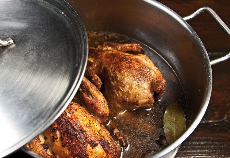 Ну вот и отлично, во всяком случае снаружи наш цыпленок принял вполне аппетитный вид (хотя внутри он, конечно, еще не готов). Аккуратно вынем тушку из масла, излишки масла выльем, оставив в кастрюле две-три столовые ложки, и быстро (причем слегка) обжарим в этом масле несколько раздавленных зубцов чеснока. Затем вольем примерно пол литра воды — теплой или горячей.