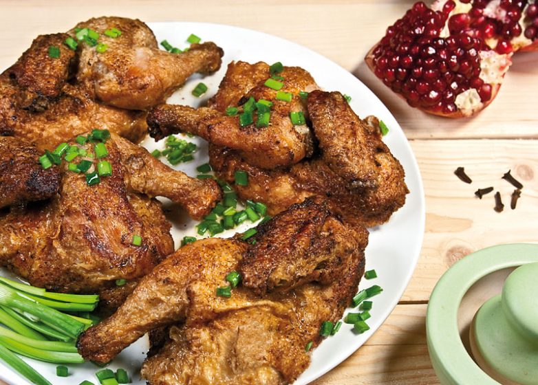 Попробуем-ка вымыть, обсушить цыпленка, а потом на сухой горячей сковороде чуть поджарить несколько зерен гвоздики, черного перца, укропа или кориандра, а главное — пару чайных ложек тертого мускатного ореха, чтобы оживить специи.