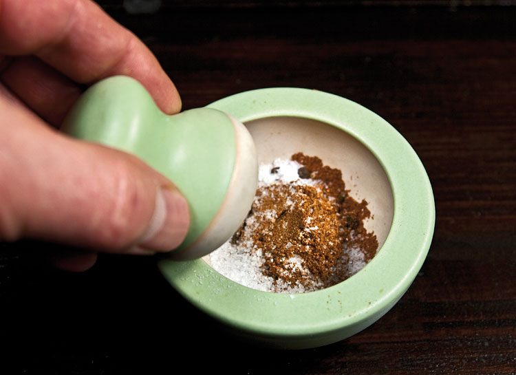 А потом разотрем поджаренные специи с чайной ложкой поваренной соли — так они лучше измельчатся, да и сам продукт не нужно будет дополнительно солить: