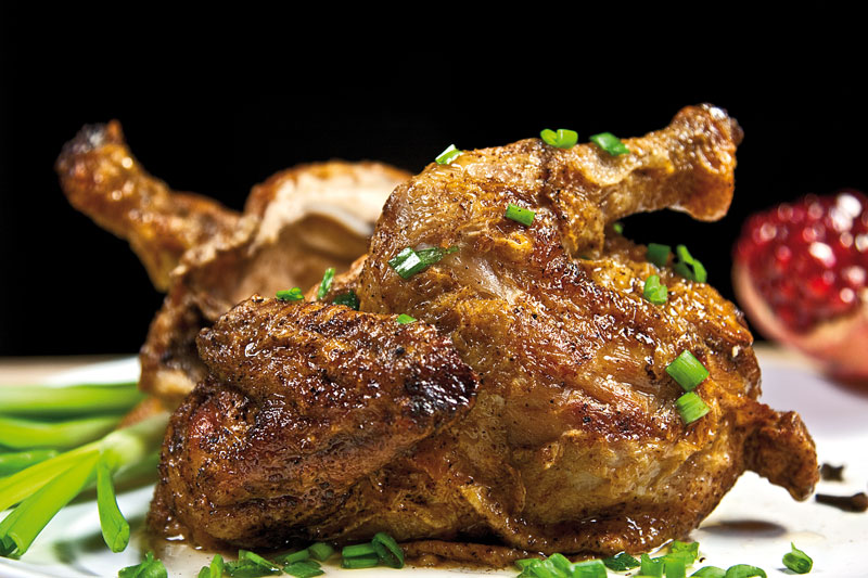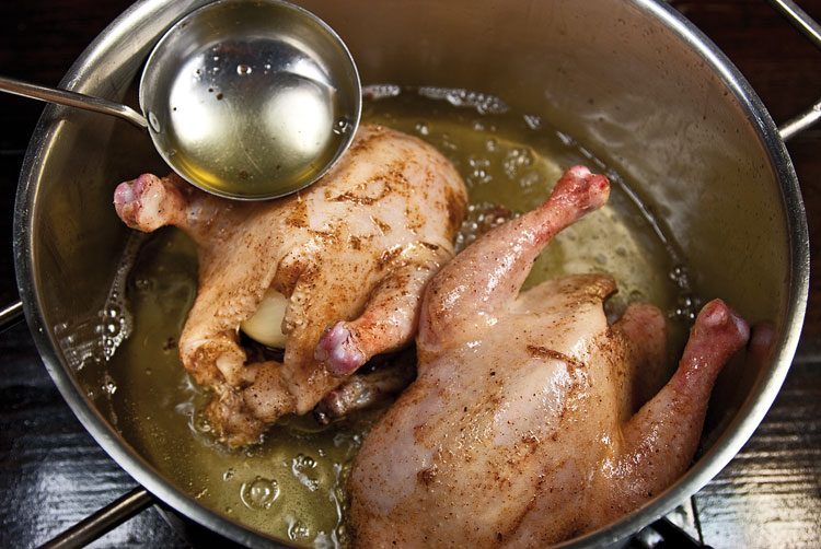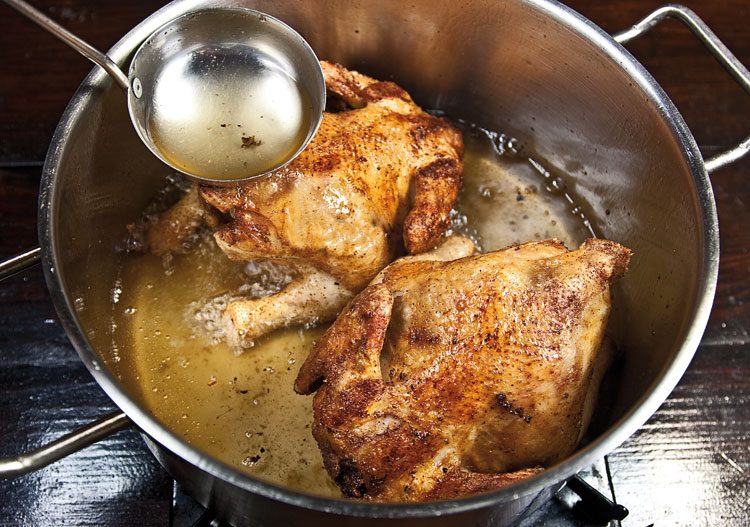 Через три часа (или больше, что лучше) в большой стальной кастрюле, воке или казане разогреем граммов 200-250 растительного масла и положим в него цыпленка спинкой вниз. Ну а пока жарится его нижняя часть, в это время раскаленным маслом, черпаемым из той же кастрюли, будем проливать верх цыпленка. Это значительно ускорит процесс его обжарки, что нам, собственно, и нужно.