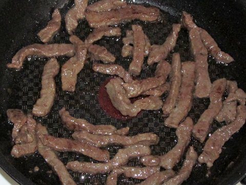 Сковороду с растительным маслом разогреваем на огне несколько сильнее среднего. Маленькими партиями обжариваем мясо, в идеале без выделения сока.