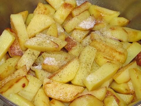 Обжаренный картофель кладём в кастрюлю с мясом. Накрываем крышкой и тушим около 15-ти минут, до готовности картошки.