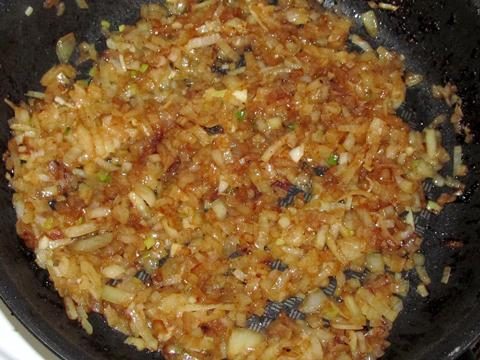 Обжариваю лук и чеснок на растительном масле. Я не менял масло после мяса, это даёт интересный цвет.