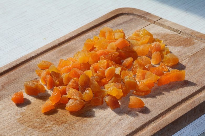 Курагу вымыть, обсушить и нарезать кубиком, примерно 0.7 см.
