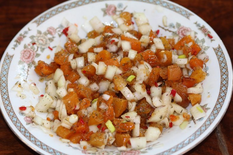 Выложить в миску репчатый лук, острый перец, курагу, орешки, джем, соль, перец черный молотый и тимьян. Все хорошо перемешать.