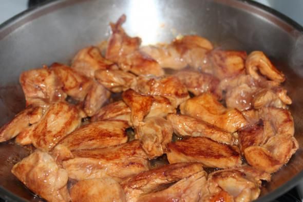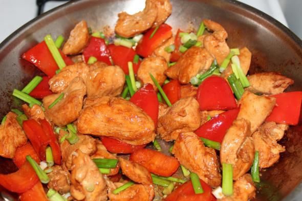 В оригинале рецепта обжаривают сначала овощи, а потом добавляют курицу.