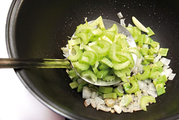 Добавим щепотку соли и щепотку молотого кориандра, вслед за ними — кусочки стеблевого сельдерея (если используется листовой, то его в порубленном виде лучше добавить в самом конце приготовления этого вида сая). Помешивая продукты шумовкой, продолжаем обжарку — еще 2-3 минуты.