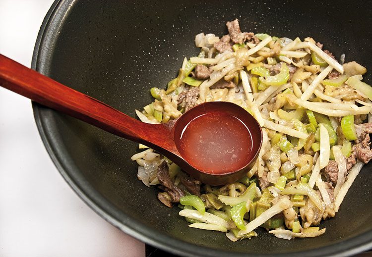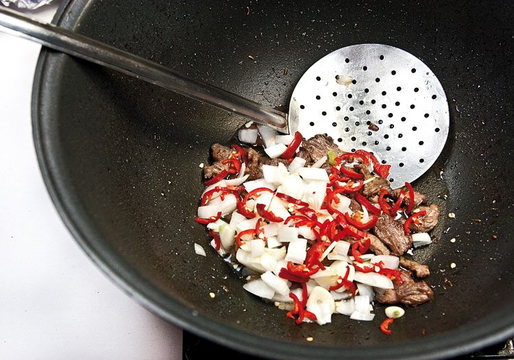 1. Прежде всего «подливой». Беру это слово в кавычки, поскольку в уйгурской версии её как таковой нет. То есть если среднеазиатская подлива в комбинации тушенных мяса и овощей содержит относительно большое количество соуса, что делает лагман полужидким, в уйгурской версии жидкости практически нет, если не считать жиров и сока мяса и овощей. Кроме того, компоненты лагмана не тушатся, а быстро обжариваются.