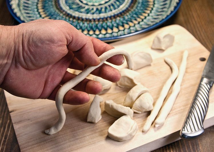 Жгут нарежем на кусочки не толще пальца и опять же с помощью ладоней «накрутим» из каждого кусочка жгуты потоньше — с карандаш.