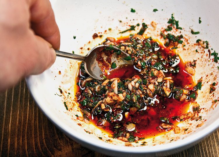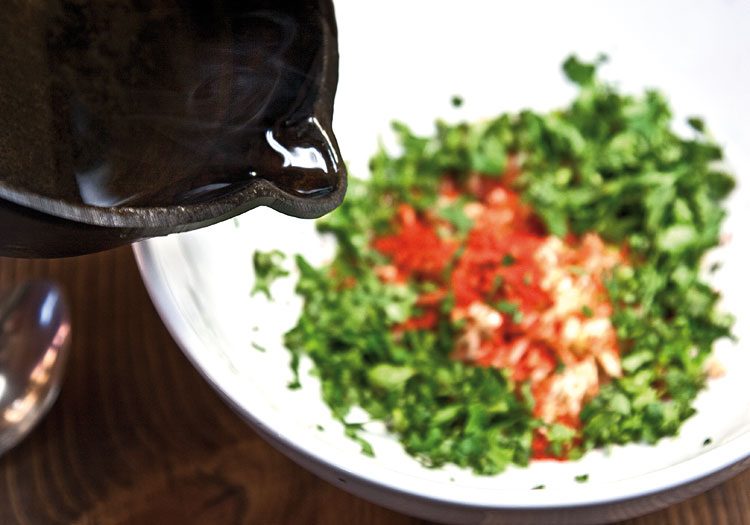 Редко, когда к лагману не подают специальную, предназначенную только для него приправу из смеси чеснока, острого молотого перца и кориандра (зовется она лаза-джан или лаза-чанг). Если есть желание приготовить эту приправу, то ею лучше заняться сразу после приготовления лапши, поскольку все иные лагманные действия протекут довольно быстро. Один из способов приготовления лаза-чанга такой. Два-три измельченных зубца чеснока перемешаем с двумя-тремя чайными ложками острого молотого перца, двумя-тремя щепотками молотого кориандра или с таким же количеством рубленой кинзы и слегка посолим. Затем в подходящей посуде сильно разогреем три-четыре столовые ложки растительного масла и вольем его в подготовленную смесь.