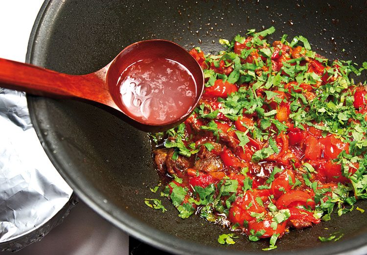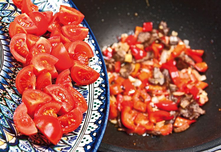 Наконец, — крупно нарезанные помидоры, с которых, при необходимости, нужно предварительно снять шкурку. Обжаривать продукты с добавлением помидоров будем ровно столько, чтобы почти полностью уварился выделившийся из помидоров сок.