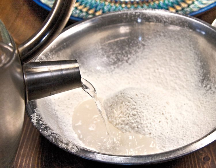 Не будем мудрить и мы. Сначала в просеянную (обязательно просеянную!) муку добавим пару щепоток соли и подольём столько теплой воды, чтобы при замешивании тесто получилось довольно крутым.
