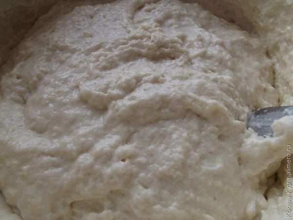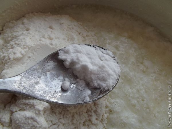 Тем временем замешиваем тесто из кефира, яйца, муки, соли и пищевой соды, которую гасим кефиром.