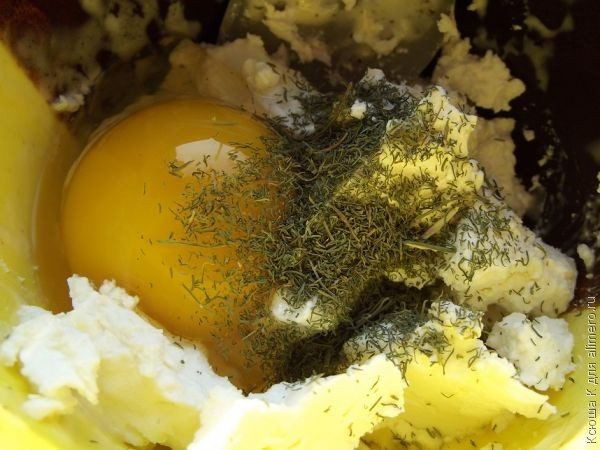 Делаем начинку. Творог смешиваем с яйцом, солью и укропом.
