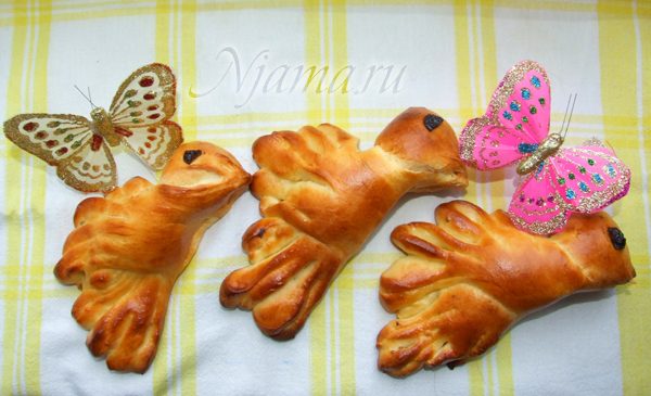 Накрываем их и оставляем на полчаса, после чего смазываем взбитым желтком и вставляем изюминки на место глазок.