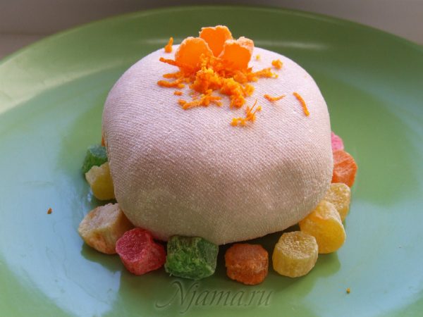 Творог протираем через сито или хорошо взбиваем в блендере.Продолжая взбивать или активно смешивать, добавляем растопленное сливочное масло, сметану, сахар, цедру и измельчённый имбирь.Как только исчезнут все комочки, перекладываем в марлю и подвешиваем на сутки.Или кладём в дуршлаг и ставим его на любую подходящую посуду. Через сутки лишняя сыворотка уйдёт.Перекладываем на тарелку, украшаем цукатами, цедрой, засахаренным имбирём, рецепт которого вы сможете найти на моём сайте.