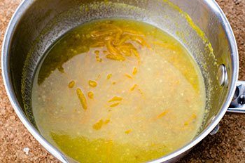 Сок с цедрой довести до кипения, добавить ложку горчицы и сливочное масло. Сварить соус (примерно 10 минут).