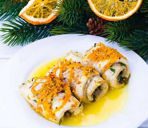 Апельсин и зерновая горчица, которые входят в состав соуса, добавляют новогоднего настроения и ярких красок. Встречайте — рыбные рулетики в горчично-апельсиновом соусе!