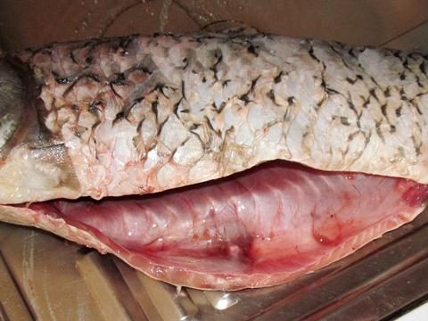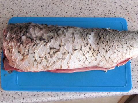 Самое сложное в приготовлении это блюда это чистка рыбы. Нужно обрезать плавники, снять чешую, которая очень крупная и прочная. Выпотрошить. Делайте разрез по брюху, немного с боку. Чтобы не задевать кости. Сначала вытаскивайте внутренности, а потом отрезаете голову.