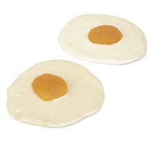 Смажьте фольгу маслом. Растопите в кастрюльке на маленьком огне 1 столовую ложку масла и 12 жевательных зефирок. Непрерывно помешивая, доведите до кипения. С помощью деревянной ложки очень быстро вылейте смесь на фольгу в виде 2 блинчиков. Возьмите 2 кусочка кураги, пальцами придайте им выпуклую форму. Положите в центр блинчиков из масла и зефира. Когда яичница застынет, переложите её на тарелку.