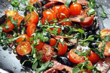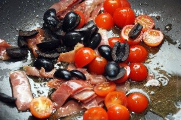 Добавить разрезанные пополам мелкие помидоры «черри» и на резанные на кружочки или четвертинки черные маслины без косточек. Немного посолить и поперчить свежемолотым черным перцем. Помешивая обжаривать 2 минуты.