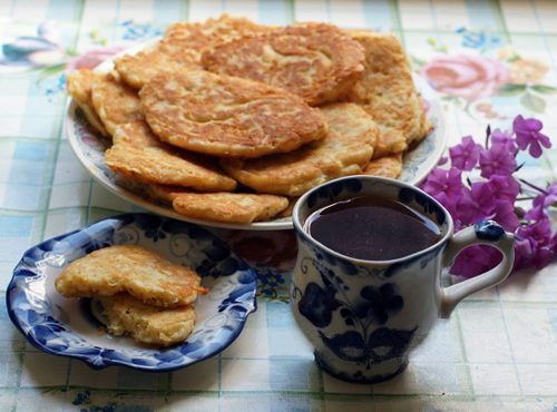 Две-три столовых ложки водки вливаем в тесто, она выступит в качестве разрыхлителя. Тесто должно получиться не крутым и не жидким, примерно как на оладьи. Можно, в принципе, и творога немного добавить, если любите, не больше 1/4 от всего объема теста.