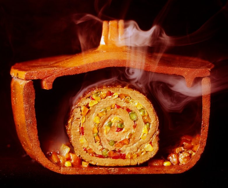 Но не только сама еда, а и посуда, в которой она находилась, на фотографиях Доминиса выглядела особенно красиво. Аргентинский мясной рулет матамбре, сфотографированный в разрезанном надвое горшочке для жарки, по-видимому, был вынут из духовки за считанные мгновения до момента съёмки. Дым, который окутывает рулет, — вовсе не пряные пары, исходящие от блюда. Это сигаретный дым, которым Доминис окутал матамбре, «чтобы он выглядел вкусно».