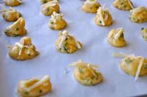 С помощью ложки выложить получившуюся массу на противень и присыпать сыром.
