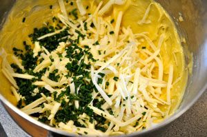 Добавить в массу 75% сыра и рубленный чеснок, хорошо перемешать.