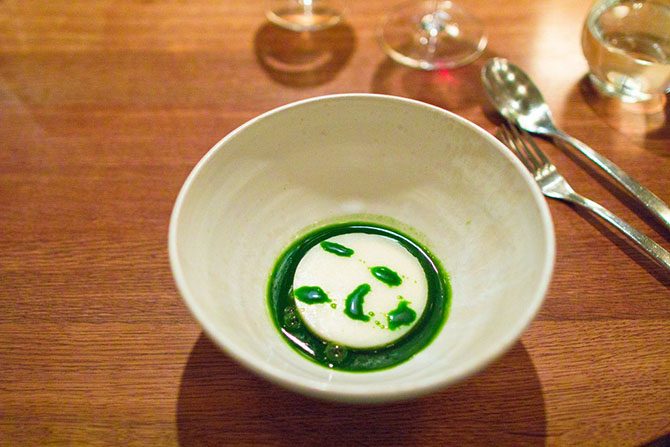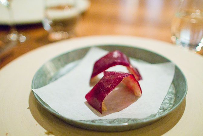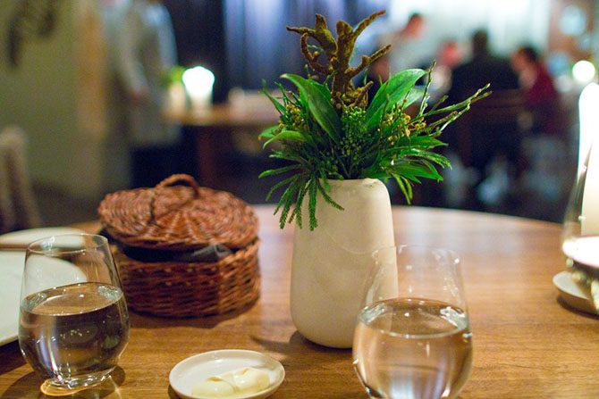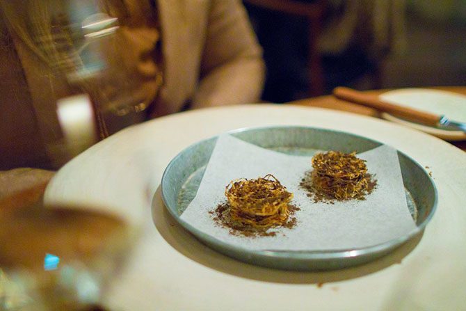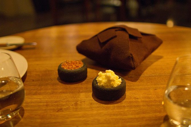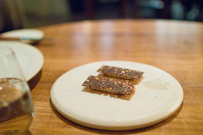 Первую закуску даже трудно отличить от сервировки стола. Это была пшеничная лепёшка и можжевельник.